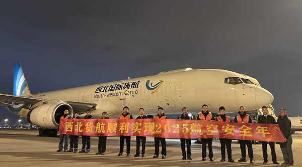 2025年12月31日,随着CO9630航班平稳落地,西北货航顺利实现2025航空安全年。公司在机场迎接执飞机组、慰问现场保障人员,向坚守岗位、齐心协力完成全年安全生产任务的全体人员表示感谢并致以新年祝福。
